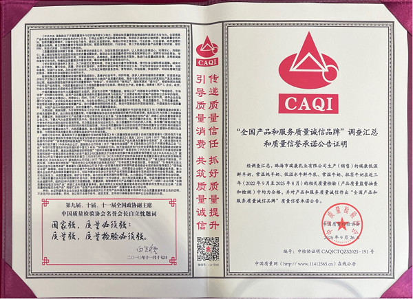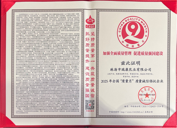 在近期举行的中国质量月活动中,瑞康乳业凭借其卓越的质量管理体系和稳定的产品质量,荣获中国质量检验协会颁发的“全国质量检验稳定合格产品”“全国行业质量领先品牌”和“全国产品和服务质量诚信品牌”等六项权威质量证书。