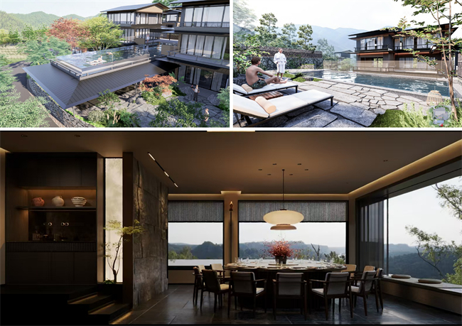 项目规划用地范围内,将打造150㎡、130㎡等39套客房,满足家庭度假、文人创作、情侣休憩等多元需求。配套建设无边泳池、禅意茶室、亲子活动区、会议中心等功能空间,同时以“源水十境”为核心打造水系景观,通过涌泉、瀑、潭、涧等八种自然水体形态,构建沉浸式亲水体验。植物配置上保留毛竹、水杉、山核桃等原生植被,增补红枫、桂花、樱花等特色品种,实现四季有景、步移景异的景观效果。